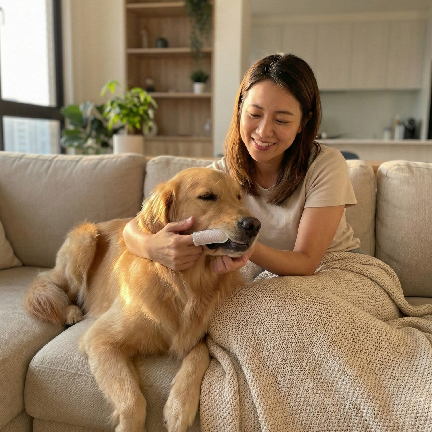 Enroulez simplement la lingette autour de votre index, soulevez légèrement la babine (pas besoin d'ouvrir la gueule) et massez les dents latérales en douceur. 30 secondes suffisent.